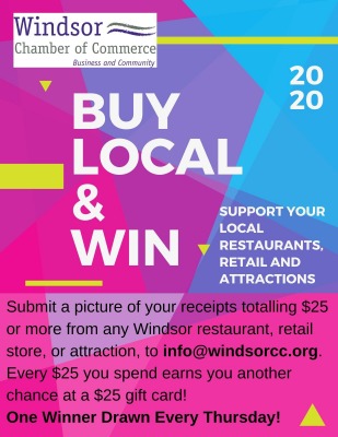 Submit a picture of your receipts totaling $25 or more from any Windsor restaurant, retail store, or attraction to info@windsorcc.org.