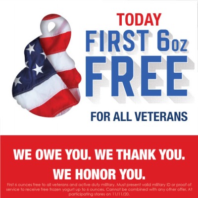 Must present military ID or proof of service to receive free frozen yogurt up to 6 ounces.